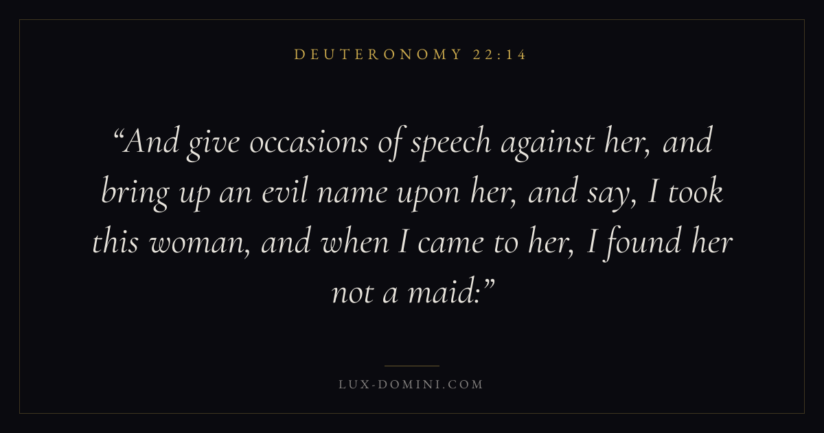 And give occasions of speech against her, and bring up an evil name upon her, and say, I took this woman, and when I came to her, I found her not a maid: