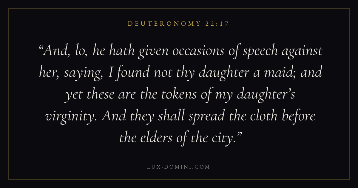 And, lo, he hath given occasions of speech against her, saying, I found not thy daughter a maid; and yet these are the tokens of my daughter’s virginity. And they shall spread the cloth before the elders of the city.