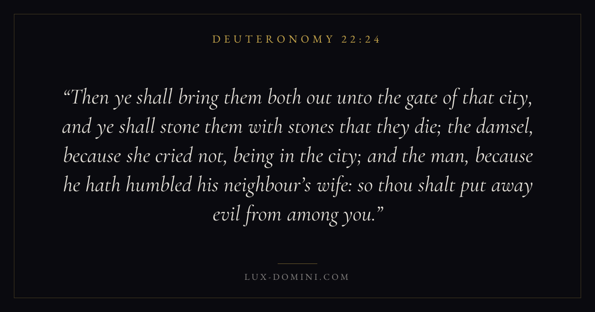 Then ye shall bring them both out unto the gate of that city, and ye shall stone them with stones that they die; the damsel, because she cried not, being in the city; and the man, because he hath humbled his neighbour’s wife: so thou shalt put away evil from among you.