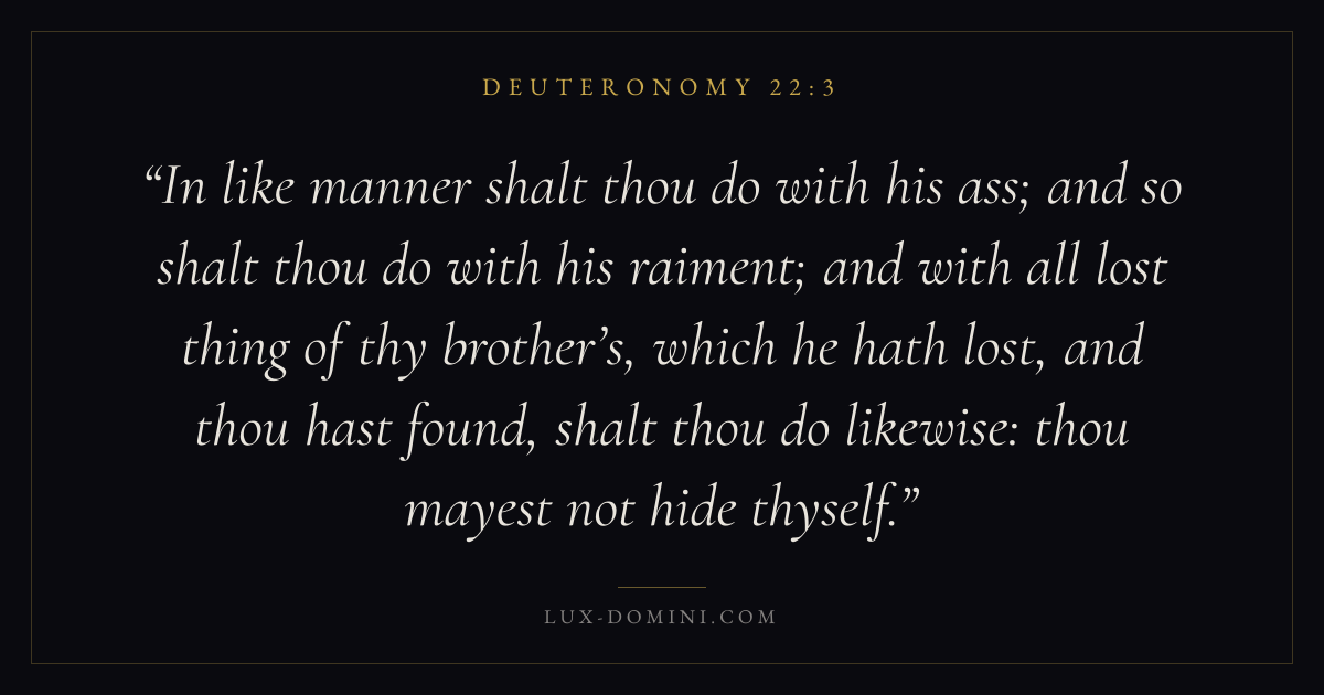 In like manner shalt thou do with his ass; and so shalt thou do with his raiment; and with all lost thing of thy brother’s, which he hath lost, and thou hast found, shalt thou do likewise: thou mayest not hide thyself.