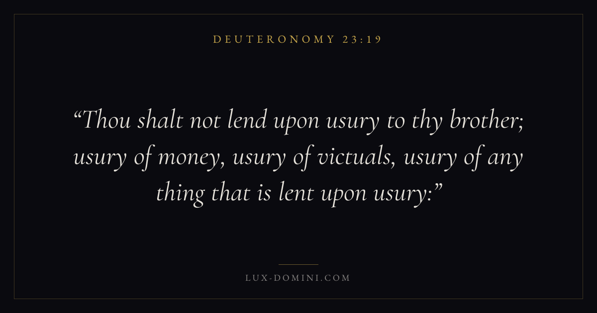 Thou shalt not lend upon usury to thy brother; usury of money, usury of victuals, usury of any thing that is lent upon usury: