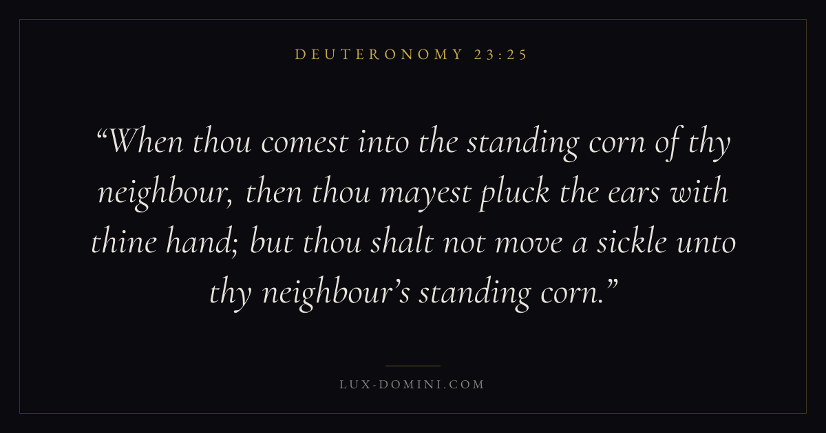 When thou comest into the standing corn of thy neighbour, then thou mayest pluck the ears with thine hand; but thou shalt not move a sickle unto thy neighbour’s standing corn.