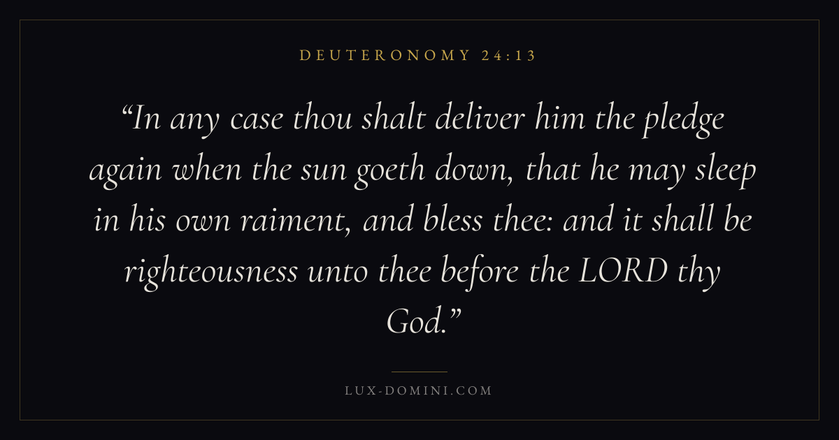 In any case thou shalt deliver him the pledge again when the sun goeth down, that he may sleep in his own raiment, and bless thee: and it shall be righteousness unto thee before the LORD thy God.