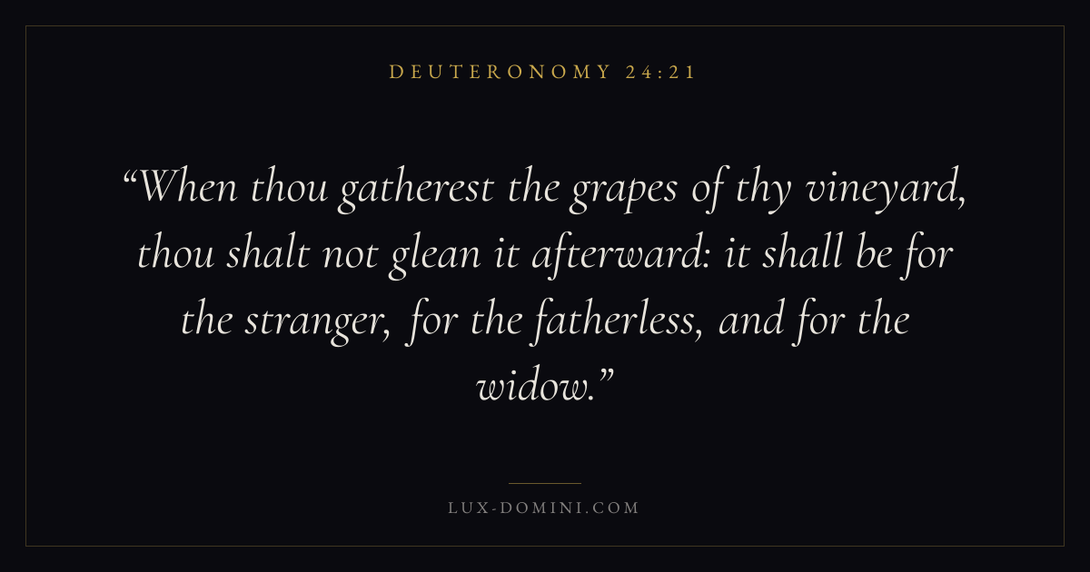 When thou gatherest the grapes of thy vineyard, thou shalt not glean it afterward: it shall be for the stranger, for the fatherless, and for the widow.