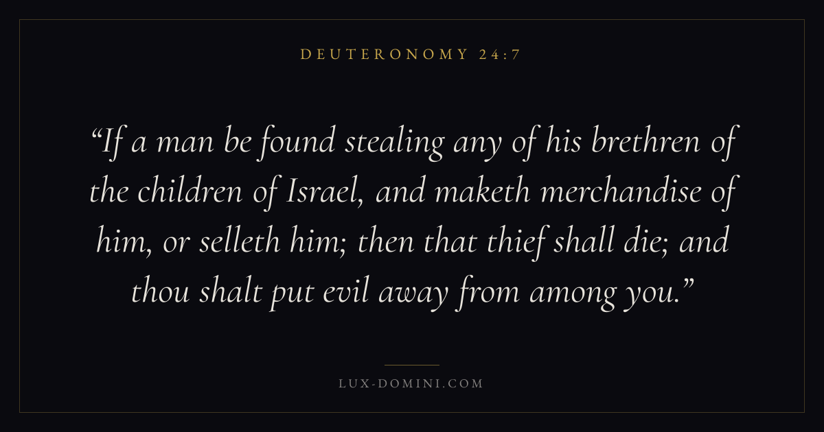 If a man be found stealing any of his brethren of the children of Israel, and maketh merchandise of him, or selleth him; then that thief shall die; and thou shalt put evil away from among you.