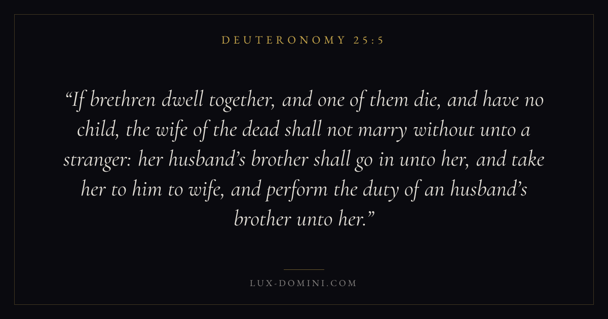 If brethren dwell together, and one of them die, and have no child, the wife of the dead shall not marry without unto a stranger: her husband’s brother shall go in unto her, and take her to him to wife, and perform the duty of an husband’s brother unto her.