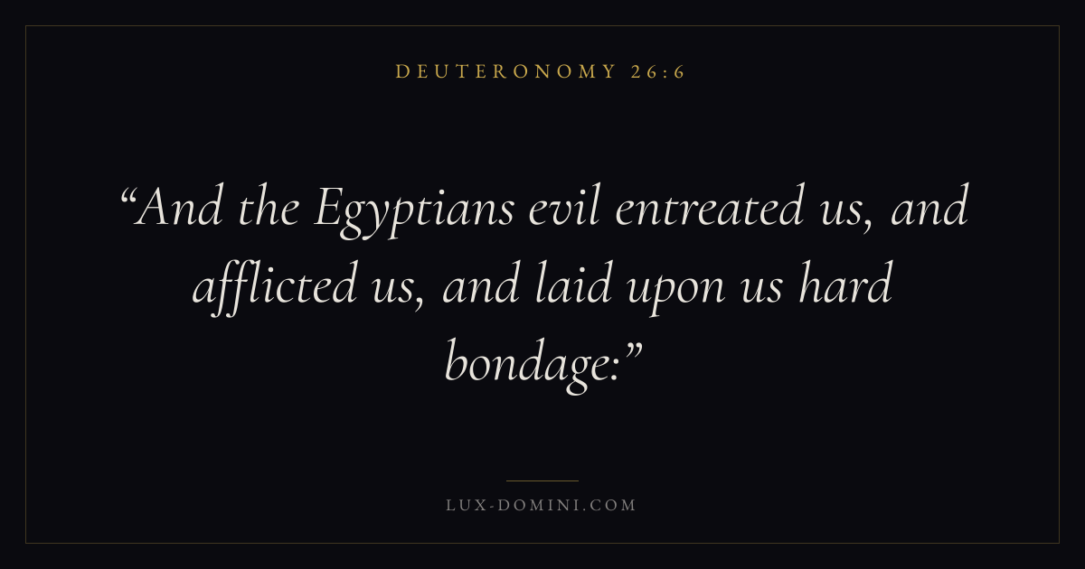 Books / Deuteronomy / Chapter 26 / Verse 6 ← Deuteronomy 26:5 Deuteronomy 26:6 Deuteronomy 26:7 → And the Egyptians evil entreated us, and afflicted us, and laid upon us hard bondage: Download verse card Share on Twitter Share on Facebook Pin it ✦ Key themes LoveHopeSuffering and trialsMemory Read with Deuteronomy 26:7Deuteronomy 26:8John 3:161 Corinthians 13:4 Related topics Bible verses about loveBible verses about hopeBible verses about suffering and trials ✦ Deuteronomy Chapter 26 verses V. 1 V. 2 V. 3 V. 4 V. 5 V. 6 V. 7 V. 8 V. 9 V. 10 V. 11 V. 12 V. 13 V. 14 V. 15 V. 16 V. 17 V. 18 V. 19