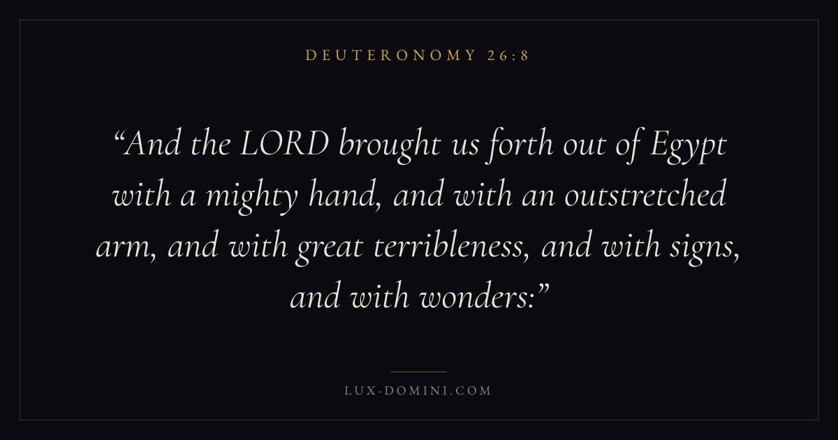 And the LORD brought us forth out of Egypt with a mighty hand, and with an outstretched arm, and with great terribleness, and with signs, and with wonders: