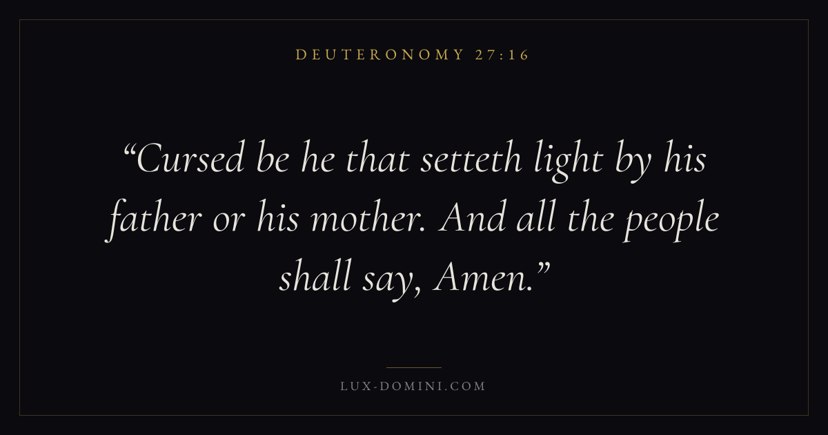 Books / Deuteronomy / Chapter 27 / Verse 16 ← Deuteronomy 27:15 Deuteronomy 27:16 Deuteronomy 27:17 → Cursed be he that setteth light by his father or his mother. And all the people shall say, Amen. Download verse card Share on Twitter Share on Facebook Pin it ✦ Key themes LoveHopePeaceMemory Read with Deuteronomy 27:17John 3:161 Corinthians 13:4Romans 8:24 Related topics Bible verses about loveBible verses about hopeBible verses about peace ✦ Deuteronomy Chapter 27 verses V. 1 V. 2 V. 3 V. 4 V. 5 V. 6 V. 7 V. 8 V. 9 V. 10 V. 11 V. 12 V. 13 V. 14 V. 15 V. 16 V. 17 V. 18 V. 19 V. 20 V. 21 V. 22 V. 23 V. 24 V. 25 V. 26