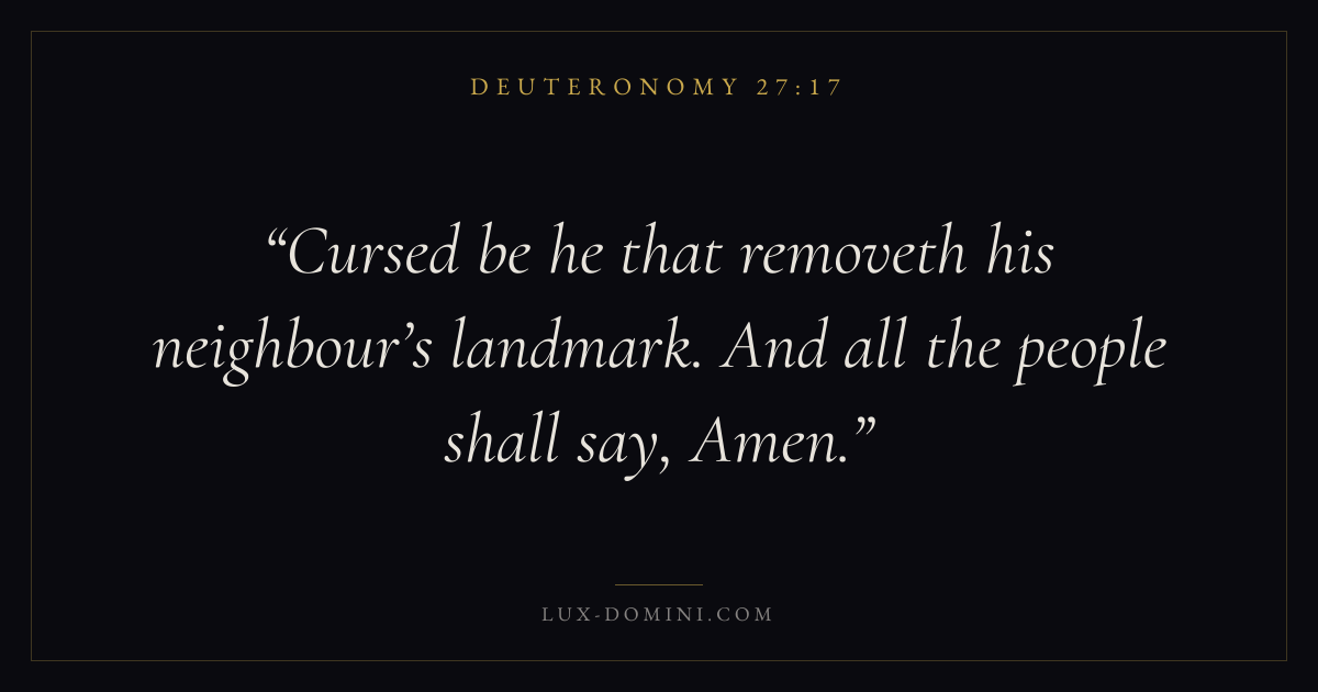 Books / Deuteronomy / Chapter 27 / Verse 17 ← Deuteronomy 27:16 Deuteronomy 27:17 Deuteronomy 27:18 → Cursed be he that removeth his neighbour’s landmark. And all the people shall say, Amen. Download verse card Share on Twitter Share on Facebook Pin it ✦ Key themes LoveHopePeaceMemory Read with Deuteronomy 27:16John 3:161 Corinthians 13:4Romans 8:24 Related topics Bible verses about loveBible verses about hopeBible verses about peace ✦ Deuteronomy Chapter 27 verses V. 1 V. 2 V. 3 V. 4 V. 5 V. 6 V. 7 V. 8 V. 9 V. 10 V. 11 V. 12 V. 13 V. 14 V. 15 V. 16 V. 17 V. 18 V. 19 V. 20 V. 21 V. 22 V. 23 V. 24 V. 25 V. 26