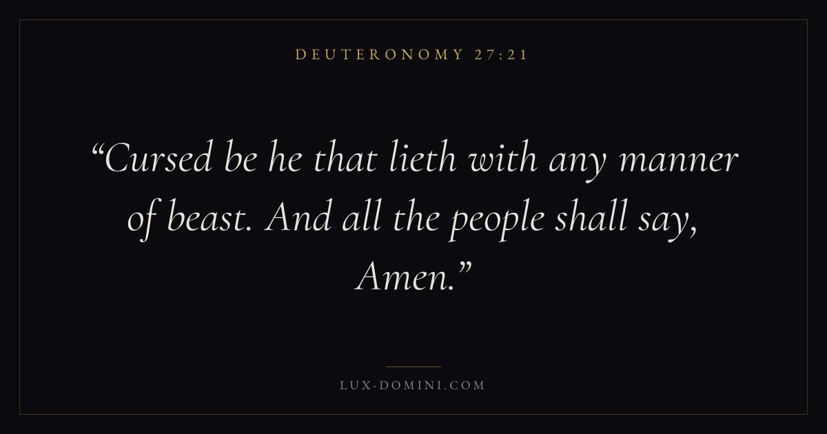 Books / Deuteronomy / Chapter 27 / Verse 21 ← Deuteronomy 27:20 Deuteronomy 27:21 Deuteronomy 27:22 → Cursed be he that lieth with any manner of beast. And all the people shall say, Amen. Download verse card Share on Twitter Share on Facebook Pin it ✦ Key themes LoveHopePeaceMemory Read with Deuteronomy 27:20John 3:161 Corinthians 13:4Romans 8:24 Related topics Bible verses about loveBible verses about hopeBible verses about peace ✦ Deuteronomy Chapter 27 verses V. 1 V. 2 V. 3 V. 4 V. 5 V. 6 V. 7 V. 8 V. 9 V. 10 V. 11 V. 12 V. 13 V. 14 V. 15 V. 16 V. 17 V. 18 V. 19 V. 20 V. 21 V. 22 V. 23 V. 24 V. 25 V. 26