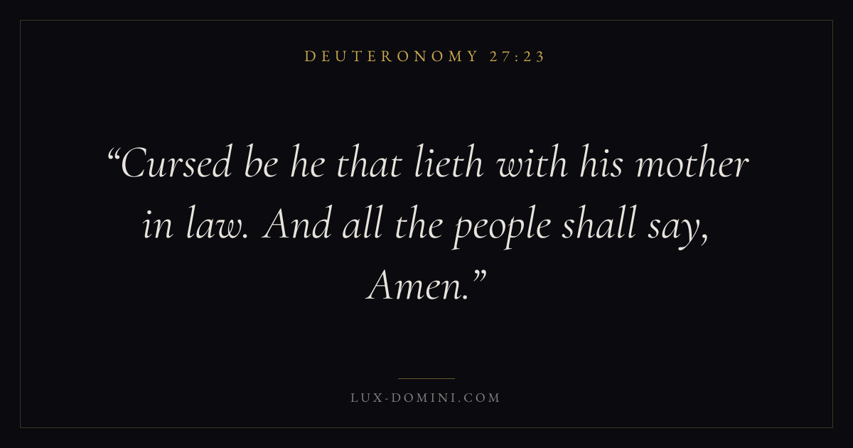 Books / Deuteronomy / Chapter 27 / Verse 23 ← Deuteronomy 27:22 Deuteronomy 27:23 Deuteronomy 27:24 → Cursed be he that lieth with his mother in law. And all the people shall say, Amen. Download verse card Share on Twitter Share on Facebook Pin it ✦ Key themes LoveHopePeaceMemory Read with Deuteronomy 27:22John 3:161 Corinthians 13:4Romans 8:24 Related topics Bible verses about loveBible verses about hopeBible verses about peace ✦ Deuteronomy Chapter 27 verses V. 1 V. 2 V. 3 V. 4 V. 5 V. 6 V. 7 V. 8 V. 9 V. 10 V. 11 V. 12 V. 13 V. 14 V. 15 V. 16 V. 17 V. 18 V. 19 V. 20 V. 21 V. 22 V. 23 V. 24 V. 25 V. 26