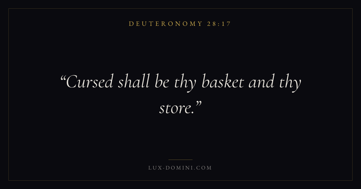 Books / Deuteronomy / Chapter 28 / Verse 17 ← Deuteronomy 28:16 Deuteronomy 28:17 Deuteronomy 28:18 → Cursed shall be thy basket and thy store. Download verse card Share on Twitter Share on Facebook Pin it ✦ Key themes LoveHopeJustice and mercyMemory Read with Deuteronomy 28:18John 3:161 Corinthians 13:4Romans 8:24 Related topics Bible verses about loveBible verses about hopeBible verses about justice and mercy ✦ Deuteronomy Chapter 28 verses V. 1 V. 2 V. 3 V. 4 V. 5 V. 6 V. 7 V. 8 V. 9 V. 10 V. 11 V. 12 V. 13 V. 14 V. 15 V. 16 V. 17 V. 18 V. 19 V. 20 V. 21 V. 22 V. 23 V. 24 V. 25 V. 26 V. 27 V. 28 V. 29 V. 30 V. 31 V. 32 V. 33 V. 34 V. 35 V. 36 V. 37 V. 38 V. 39 V. 40 V. 41 V. 42 V. 43 V. 44 V. 45 V. 46 V. 47 V. 48 V. 49 V. 50 V. 51 V. 52 V. 53 V. 54 V. 55 V. 56 V. 57 V. 58 V. 59 V. 60 V. 61 V. 62 V. 63 V. 64 V. 65 V. 66 V. 67 V. 68