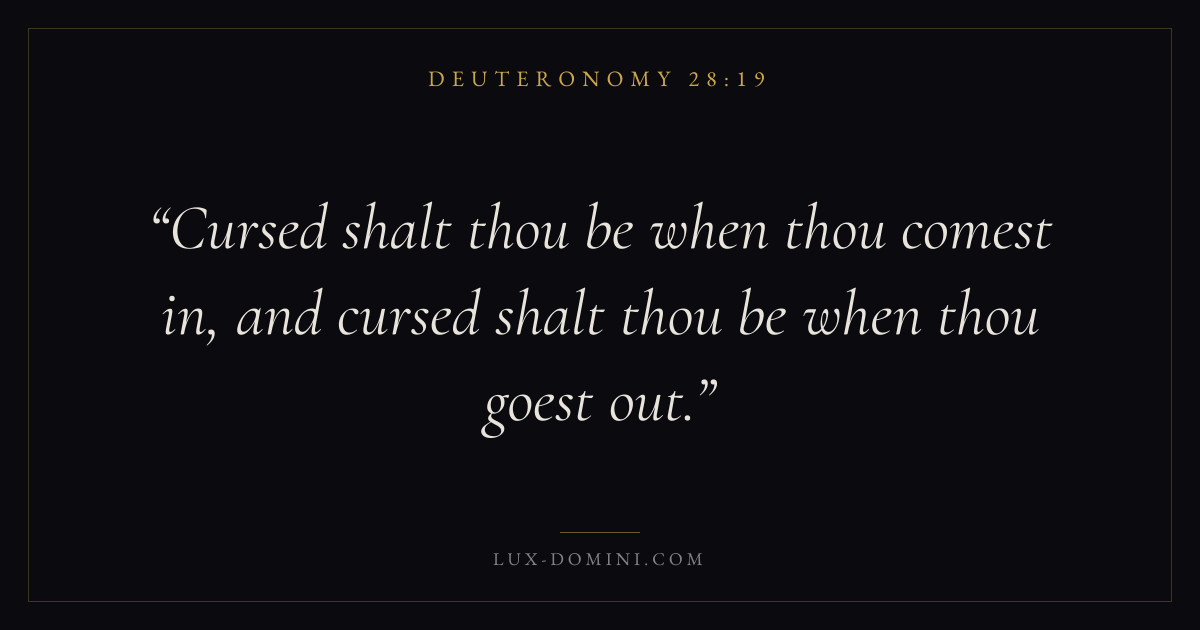 Books / Deuteronomy / Chapter 28 / Verse 19 ← Deuteronomy 28:18 Deuteronomy 28:19 Deuteronomy 28:20 → Cursed shalt thou be when thou comest in, and cursed shalt thou be when thou goest out. Download verse card Share on Twitter Share on Facebook Pin it ✦ Key themes LoveHopeJustice and mercyMemory Read with Deuteronomy 28:20Deuteronomy 28:21John 3:161 Corinthians 13:4 Related topics Bible verses about loveBible verses about hopeBible verses about justice and mercy ✦ Deuteronomy Chapter 28 verses V. 1 V. 2 V. 3 V. 4 V. 5 V. 6 V. 7 V. 8 V. 9 V. 10 V. 11 V. 12 V. 13 V. 14 V. 15 V. 16 V. 17 V. 18 V. 19 V. 20 V. 21 V. 22 V. 23 V. 24 V. 25 V. 26 V. 27 V. 28 V. 29 V. 30 V. 31 V. 32 V. 33 V. 34 V. 35 V. 36 V. 37 V. 38 V. 39 V. 40 V. 41 V. 42 V. 43 V. 44 V. 45 V. 46 V. 47 V. 48 V. 49 V. 50 V. 51 V. 52 V. 53 V. 54 V. 55 V. 56 V. 57 V. 58 V. 59 V. 60 V. 61 V. 62 V. 63 V. 64 V. 65 V. 66 V. 67 V. 68