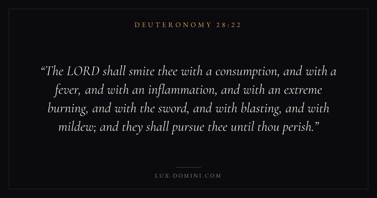 The LORD shall smite thee with a consumption, and with a fever, and with an inflammation, and with an extreme burning, and with the sword, and with blasting, and with mildew; and they shall pursue thee until thou perish.