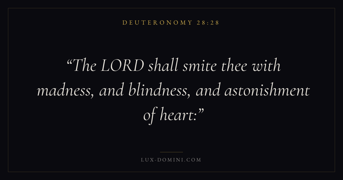 Books / Deuteronomy / Chapter 28 / Verse 28 ← Deuteronomy 28:27 Deuteronomy 28:28 Deuteronomy 28:29 → The LORD shall smite thee with madness, and blindness, and astonishment of heart: Download verse card Share on Twitter Share on Facebook Pin it ✦ Key themes LoveHopeJustice and mercyMemory Read with Deuteronomy 28:29John 3:161 Corinthians 13:4Romans 8:24 Related topics Bible verses about loveBible verses about hopeBible verses about justice and mercy ✦ Deuteronomy Chapter 28 verses V. 1 V. 2 V. 3 V. 4 V. 5 V. 6 V. 7 V. 8 V. 9 V. 10 V. 11 V. 12 V. 13 V. 14 V. 15 V. 16 V. 17 V. 18 V. 19 V. 20 V. 21 V. 22 V. 23 V. 24 V. 25 V. 26 V. 27 V. 28 V. 29 V. 30 V. 31 V. 32 V. 33 V. 34 V. 35 V. 36 V. 37 V. 38 V. 39 V. 40 V. 41 V. 42 V. 43 V. 44 V. 45 V. 46 V. 47 V. 48 V. 49 V. 50 V. 51 V. 52 V. 53 V. 54 V. 55 V. 56 V. 57 V. 58 V. 59 V. 60 V. 61 V. 62 V. 63 V. 64 V. 65 V. 66 V. 67 V. 68