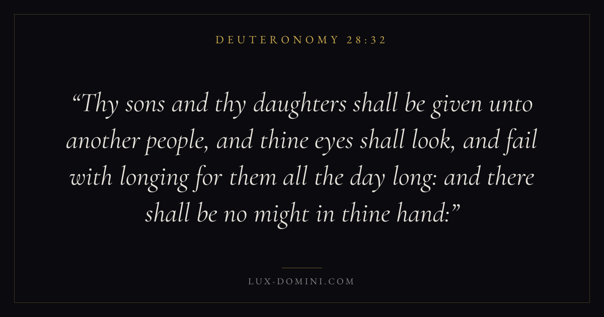Thy sons and thy daughters shall be given unto another people, and thine eyes shall look, and fail with longing for them all the day long: and there shall be no might in thine hand: