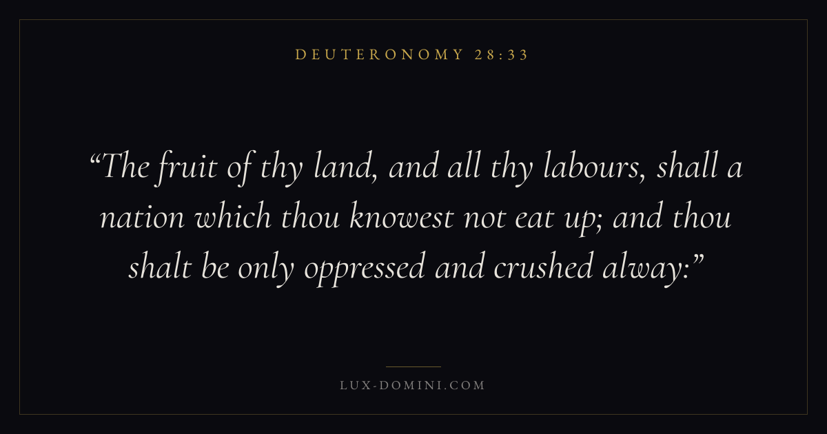 The fruit of thy land, and all thy labours, shall a nation which thou knowest not eat up; and thou shalt be only oppressed and crushed alway:
