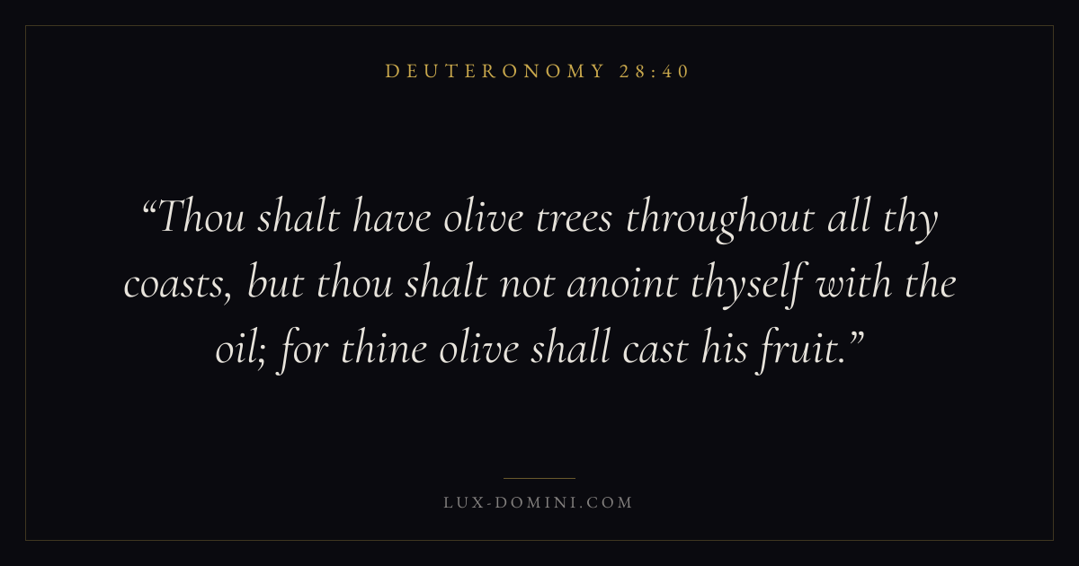 Thou shalt have olive trees throughout all thy coasts, but thou shalt not anoint thyself with the oil; for thine olive shall cast his fruit.