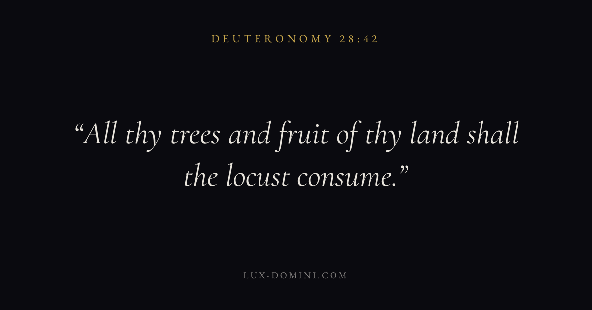 Books / Deuteronomy / Chapter 28 / Verse 42 ← Deuteronomy 28:41 Deuteronomy 28:42 Deuteronomy 28:43 → All thy trees and fruit of thy land shall the locust consume. Download verse card Share on Twitter Share on Facebook Pin it ✦ Key themes LoveHopeJustice and mercyMemory Read with Deuteronomy 28:43Deuteronomy 28:44John 3:161 Corinthians 13:4 Related topics Bible verses about loveBible verses about hopeBible verses about justice and mercy ✦ Deuteronomy Chapter 28 verses V. 1 V. 2 V. 3 V. 4 V. 5 V. 6 V. 7 V. 8 V. 9 V. 10 V. 11 V. 12 V. 13 V. 14 V. 15 V. 16 V. 17 V. 18 V. 19 V. 20 V. 21 V. 22 V. 23 V. 24 V. 25 V. 26 V. 27 V. 28 V. 29 V. 30 V. 31 V. 32 V. 33 V. 34 V. 35 V. 36 V. 37 V. 38 V. 39 V. 40 V. 41 V. 42 V. 43 V. 44 V. 45 V. 46 V. 47 V. 48 V. 49 V. 50 V. 51 V. 52 V. 53 V. 54 V. 55 V. 56 V. 57 V. 58 V. 59 V. 60 V. 61 V. 62 V. 63 V. 64 V. 65 V. 66 V. 67 V. 68