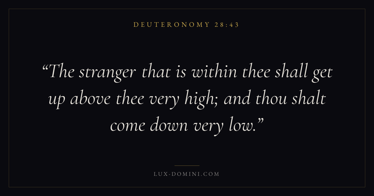 The stranger that is within thee shall get up above thee very high; and thou shalt come down very low.