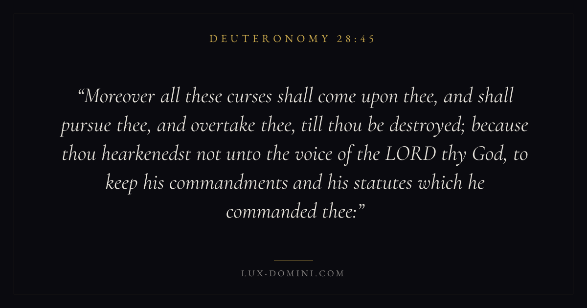 Moreover all these curses shall come upon thee, and shall pursue thee, and overtake thee, till thou be destroyed; because thou hearkenedst not unto the voice of the LORD thy God, to keep his commandments and his statutes which he commanded thee: