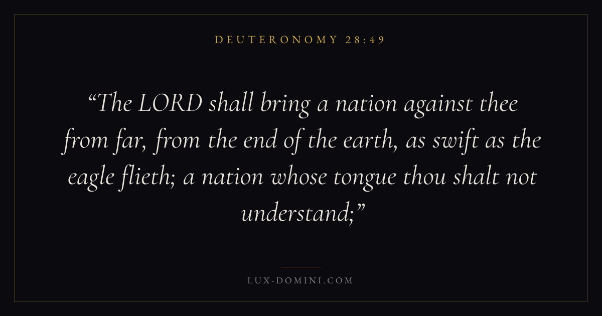 The LORD shall bring a nation against thee from far, from the end of the earth, as swift as the eagle flieth; a nation whose tongue thou shalt not understand;