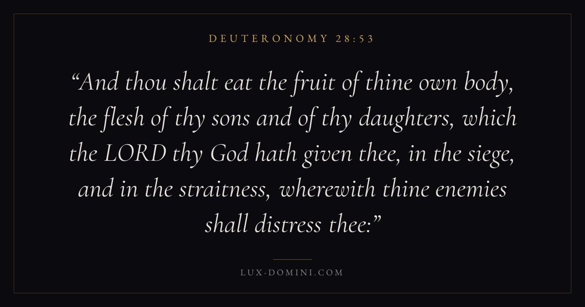 And thou shalt eat the fruit of thine own body, the flesh of thy sons and of thy daughters, which the LORD thy God hath given thee, in the siege, and in the straitness, wherewith thine enemies shall distress thee: