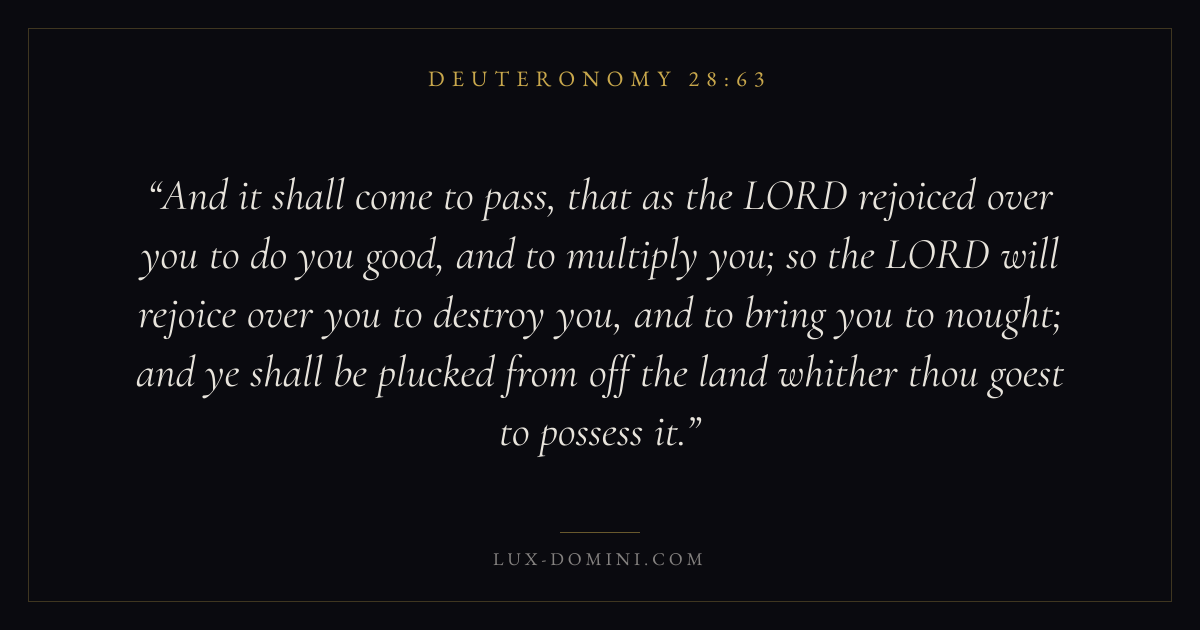 And it shall come to pass, that as the LORD rejoiced over you to do you good, and to multiply you; so the LORD will rejoice over you to destroy you, and to bring you to nought; and ye shall be plucked from off the land whither thou goest to possess it.