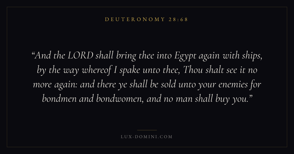 And the LORD shall bring thee into Egypt again with ships, by the way whereof I spake unto thee, Thou shalt see it no more again: and there ye shall be sold unto your enemies for bondmen and bondwomen, and no man shall buy you.