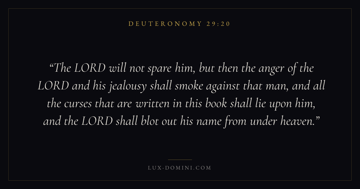 The LORD will not spare him, but then the anger of the LORD and his jealousy shall smoke against that man, and all the curses that are written in this book shall lie upon him, and the LORD shall blot out his name from under heaven.