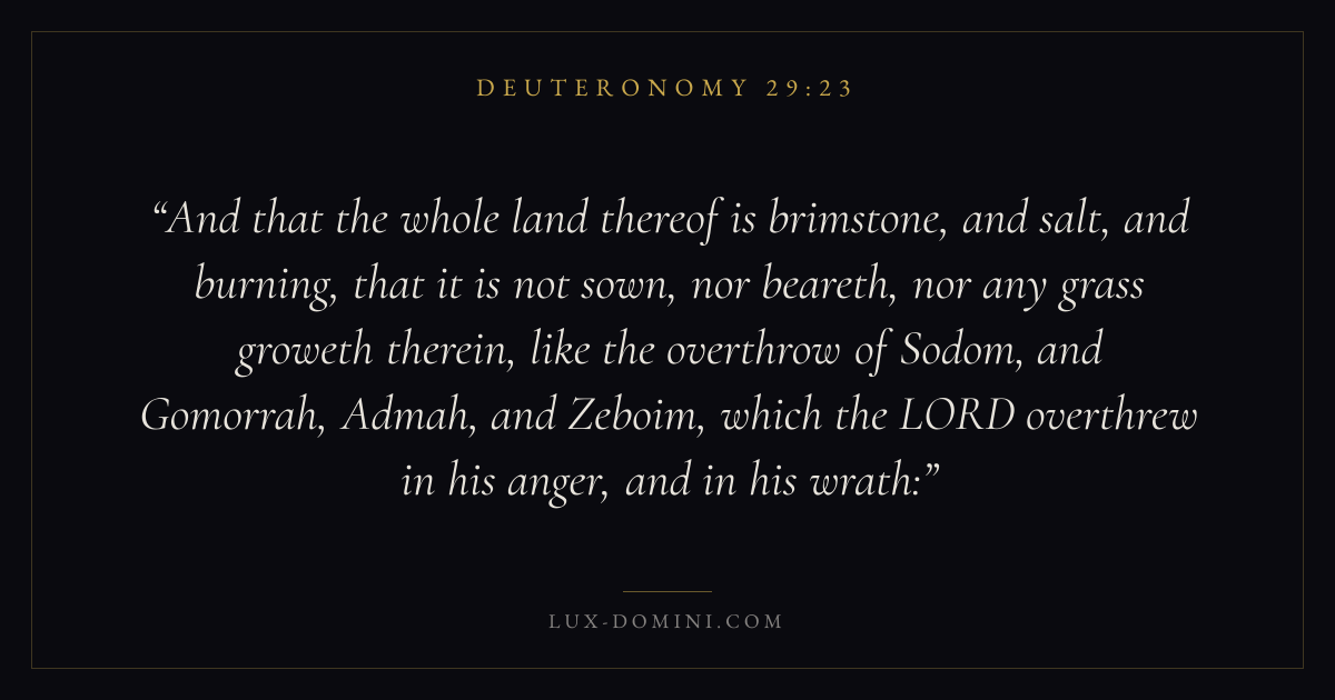 And that the whole land thereof is brimstone, and salt, and burning, that it is not sown, nor beareth, nor any grass groweth therein, like the overthrow of Sodom, and Gomorrah, Admah, and Zeboim, which the LORD overthrew in his anger, and in his wrath: