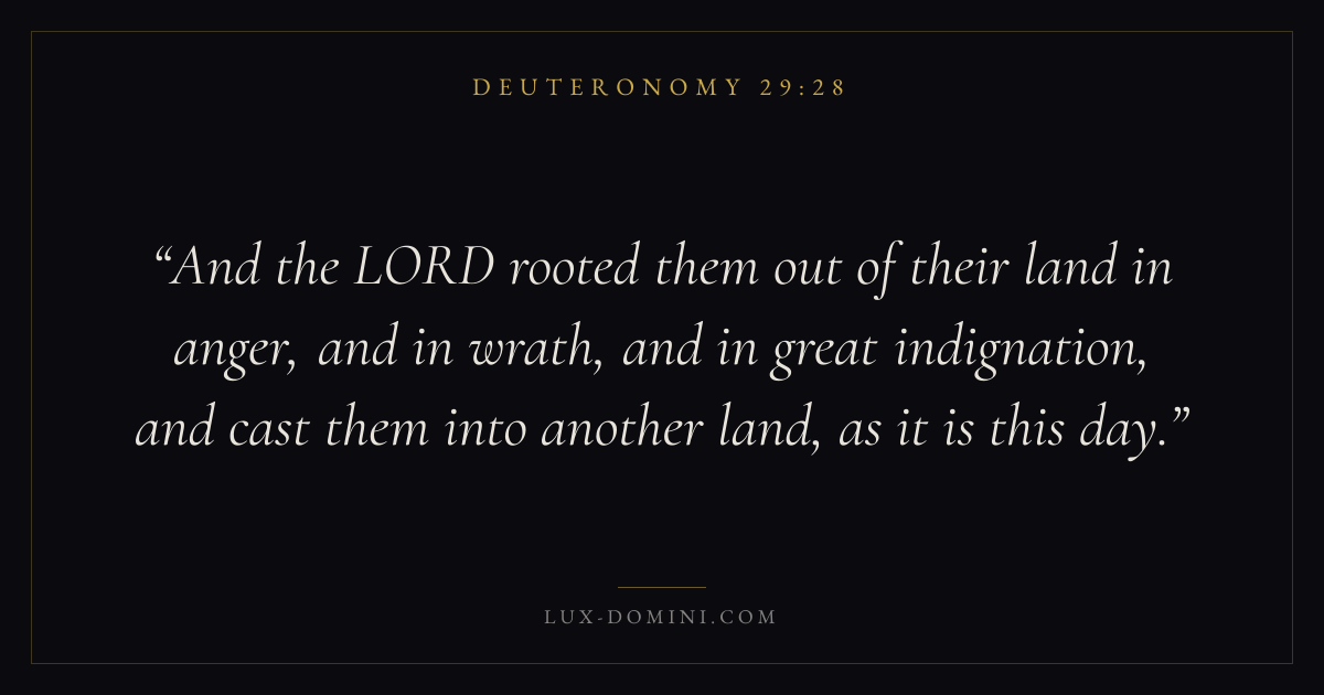 And the LORD rooted them out of their land in anger, and in wrath, and in great indignation, and cast them into another land, as it is this day.
