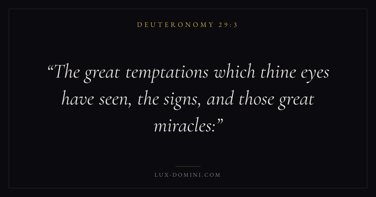 Books / Deuteronomy / Chapter 29 / Verse 3 ← Deuteronomy 29:2 Deuteronomy 29:3 Deuteronomy 29:4 → The great temptations which thine eyes have seen, the signs, and those great miracles: Download verse card Share on Twitter Share on Facebook Pin it ✦ Key themes LoveWisdomGraceMemory Read with Deuteronomy 29:2Deuteronomy 29:4John 3:161 Corinthians 13:4 Related topics Bible verses about loveBible verses about wisdomBible verses about grace ✦ Deuteronomy Chapter 29 verses V. 1 V. 2 V. 3 V. 4 V. 5 V. 6 V. 7 V. 8 V. 9 V. 10 V. 11 V. 12 V. 13 V. 14 V. 15 V. 16 V. 17 V. 18 V. 19 V. 20 V. 21 V. 22 V. 23 V. 24 V. 25 V. 26 V. 27 V. 28 V. 29
