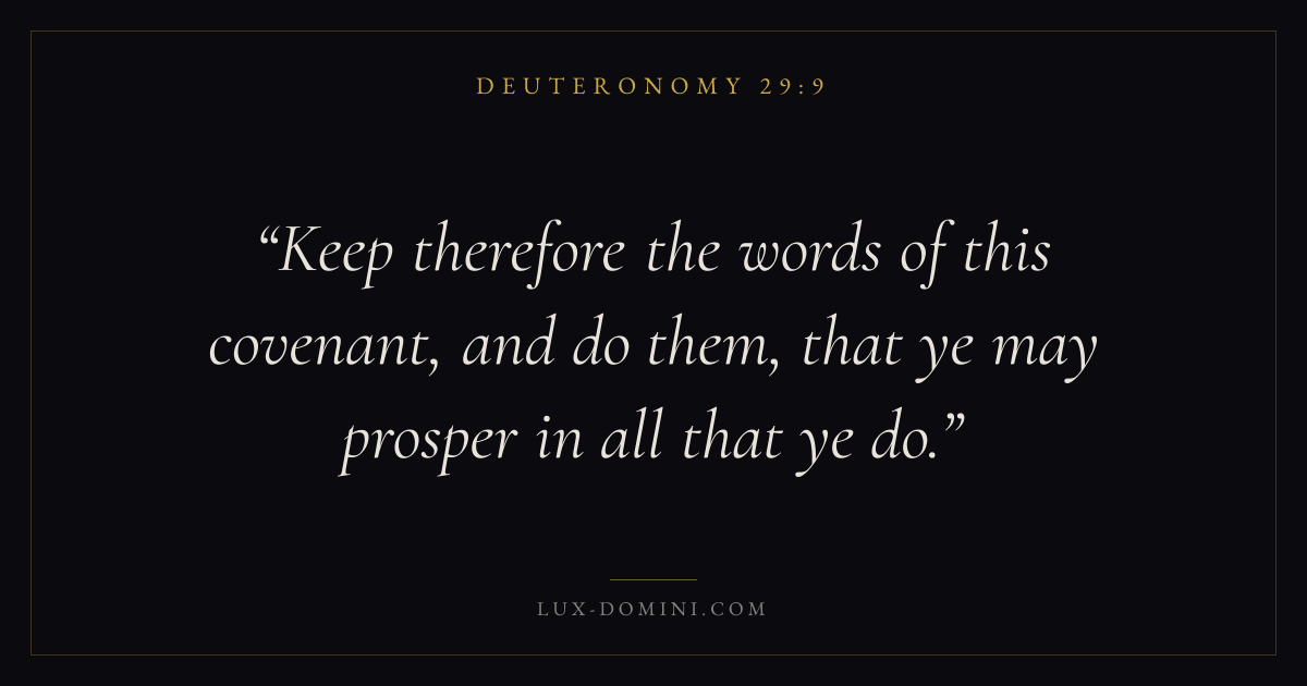 Books / Deuteronomy / Chapter 29 / Verse 9 ← Deuteronomy 29:8 Deuteronomy 29:9 Deuteronomy 29:10 → Keep therefore the words of this covenant, and do them, that ye may prosper in all that ye do. Download verse card Share on Twitter Share on Facebook Pin it ✦ Key themes LoveWisdomGraceMemory Read with Deuteronomy 29:6Deuteronomy 29:7John 3:161 Corinthians 13:4 Related topics Bible verses about loveBible verses about wisdomBible verses about grace ✦ Deuteronomy Chapter 29 verses V. 1 V. 2 V. 3 V. 4 V. 5 V. 6 V. 7 V. 8 V. 9 V. 10 V. 11 V. 12 V. 13 V. 14 V. 15 V. 16 V. 17 V. 18 V. 19 V. 20 V. 21 V. 22 V. 23 V. 24 V. 25 V. 26 V. 27 V. 28 V. 29
