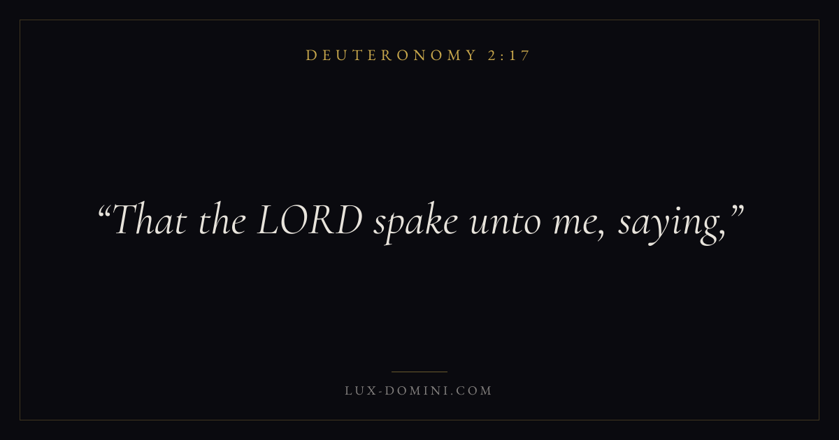 Books / Deuteronomy / Chapter 2 / Verse 17 ← Deuteronomy 2:16 Deuteronomy 2:17 Deuteronomy 2:18 → That the LORD spake unto me, saying, Download verse card Share on Twitter Share on Facebook Pin it ✦ Key themes LoveMemoryCovenantLove of God Read with Deuteronomy 2:16Deuteronomy 2:18John 3:161 Corinthians 13:4 Related topics Bible verses about love ✦ Deuteronomy Chapter 2 verses V. 1 V. 2 V. 3 V. 4 V. 5 V. 6 V. 7 V. 8 V. 9 V. 10 V. 11 V. 12 V. 13 V. 14 V. 15 V. 16 V. 17 V. 18 V. 19 V. 20 V. 21 V. 22 V. 23 V. 24 V. 25 V. 26 V. 27 V. 28 V. 29 V. 30 V. 31 V. 32 V. 33 V. 34 V. 35 V. 36 V. 37