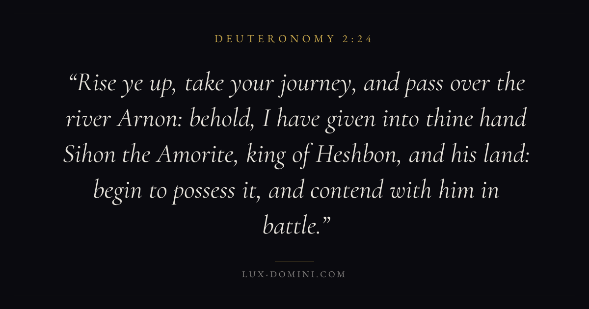 Rise ye up, take your journey, and pass over the river Arnon: behold, I have given into thine hand Sihon the Amorite, king of Heshbon, and his land: begin to possess it, and contend with him in battle.