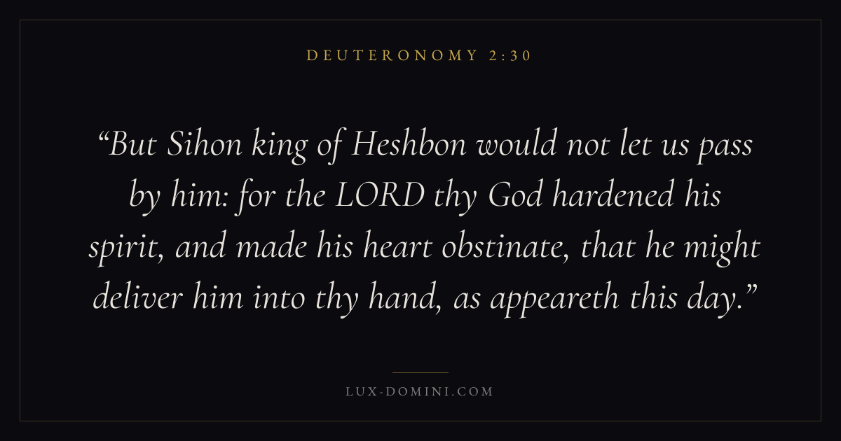 But Sihon king of Heshbon would not let us pass by him: for the LORD thy God hardened his spirit, and made his heart obstinate, that he might deliver him into thy hand, as appeareth this day.