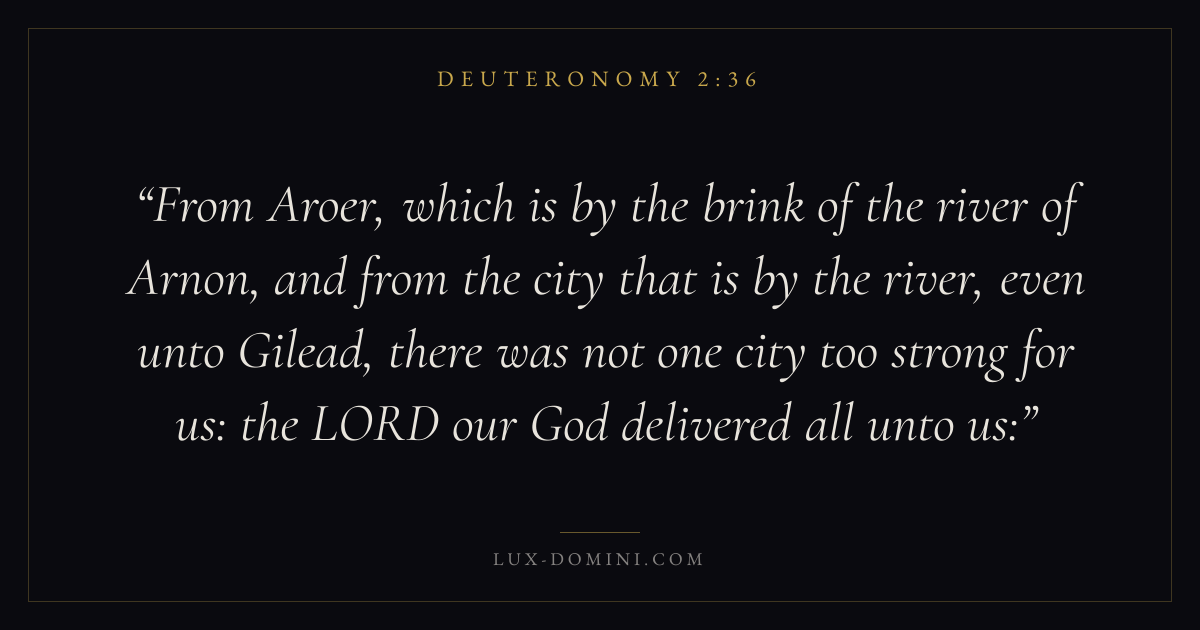 From Aroer, which is by the brink of the river of Arnon, and from the city that is by the river, even unto Gilead, there was not one city too strong for us: the LORD our God delivered all unto us: