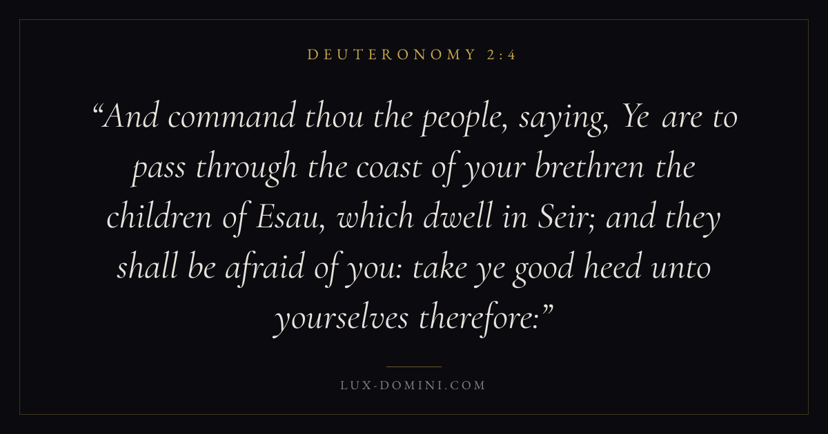 And command thou the people, saying, Ye are to pass through the coast of your brethren the children of Esau, which dwell in Seir; and they shall be afraid of you: take ye good heed unto yourselves therefore:
