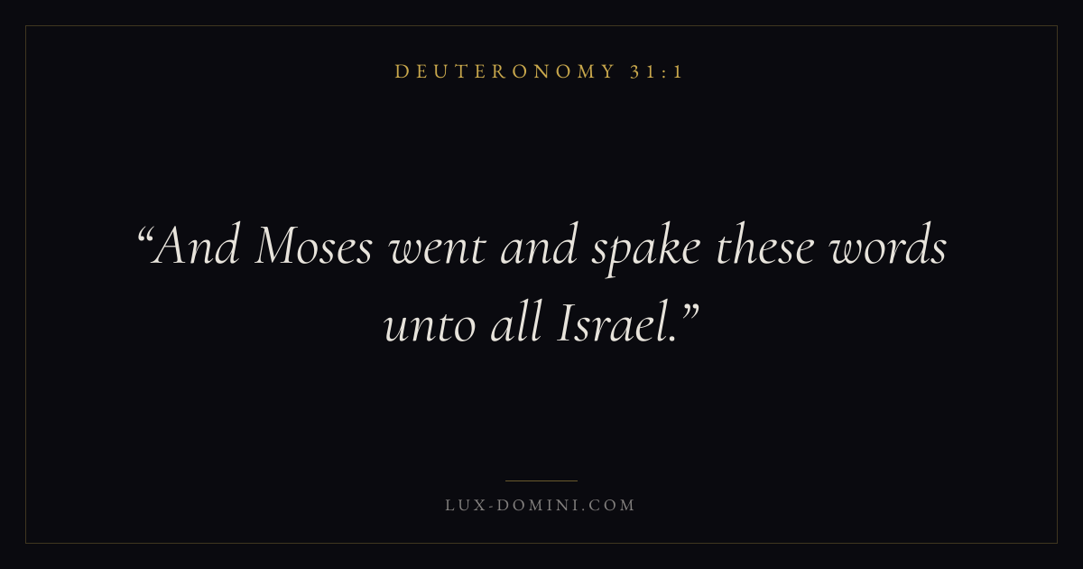 Books / Deuteronomy / Chapter 31 / Verse 1 ← Deuteronomy 30:20 Deuteronomy 31:1 Deuteronomy 31:2 → And Moses went and spake these words unto all Israel. Download verse card Share on Twitter Share on Facebook Pin it ✦ Key themes LoveFaithHopeMemory Read with Deuteronomy 31:2John 3:161 Corinthians 13:4Hebrews 11:1 Related topics Bible verses about loveBible verses about faithBible verses about hope ✦ Deuteronomy Chapter 31 verses V. 1 V. 2 V. 3 V. 4 V. 5 V. 6 V. 7 V. 8 V. 9 V. 10 V. 11 V. 12 V. 13 V. 14 V. 15 V. 16 V. 17 V. 18 V. 19 V. 20 V. 21 V. 22 V. 23 V. 24 V. 25 V. 26 V. 27 V. 28 V. 29 V. 30