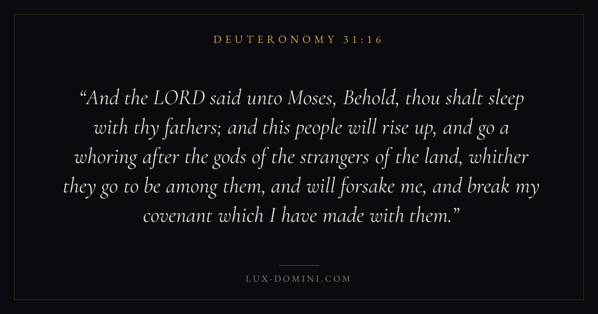 And the LORD said unto Moses, Behold, thou shalt sleep with thy fathers; and this people will rise up, and go a whoring after the gods of the strangers of the land, whither they go to be among them, and will forsake me, and break my covenant which I have made with them.