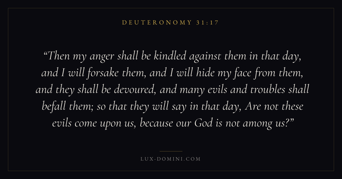Then my anger shall be kindled against them in that day, and I will forsake them, and I will hide my face from them, and they shall be devoured, and many evils and troubles shall befall them; so that they will say in that day, Are not these evils come upon us, because our God is not among us?