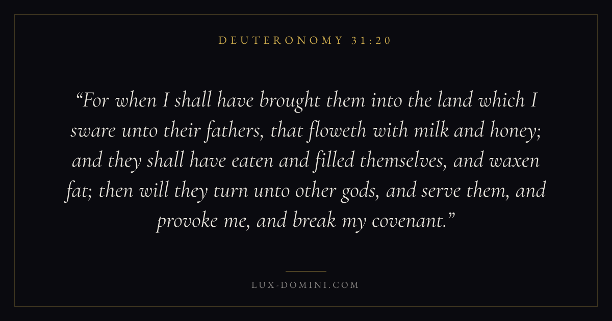 For when I shall have brought them into the land which I sware unto their fathers, that floweth with milk and honey; and they shall have eaten and filled themselves, and waxen fat; then will they turn unto other gods, and serve them, and provoke me, and break my covenant.