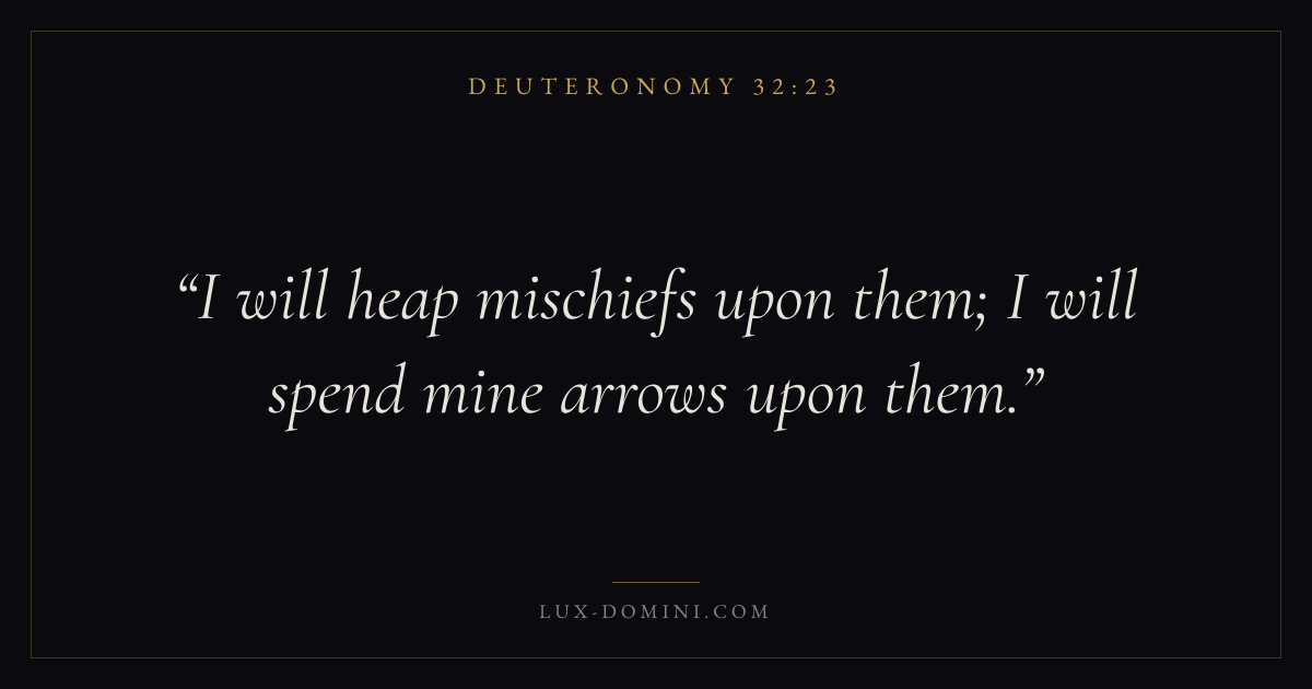 Books / Deuteronomy / Chapter 32 / Verse 23 ← Deuteronomy 32:22 Deuteronomy 32:23 Deuteronomy 32:24 → I will heap mischiefs upon them; I will spend mine arrows upon them. Download verse card Share on Twitter Share on Facebook Pin it ✦ Key themes LoveJustice and mercyMemoryCovenant Read with Deuteronomy 32:24Deuteronomy 32:25John 3:161 Corinthians 13:4 Related topics Bible verses about loveBible verses about justice and mercy ✦ Deuteronomy Chapter 32 verses V. 1 V. 2 V. 3 V. 4 V. 5 V. 6 V. 7 V. 8 V. 9 V. 10 V. 11 V. 12 V. 13 V. 14 V. 15 V. 16 V. 17 V. 18 V. 19 V. 20 V. 21 V. 22 V. 23 V. 24 V. 25 V. 26 V. 27 V. 28 V. 29 V. 30 V. 31 V. 32 V. 33 V. 34 V. 35 V. 36 V. 37 V. 38 V. 39 V. 40 V. 41 V. 42 V. 43 V. 44 V. 45 V. 46 V. 47 V. 48 V. 49 V. 50 V. 51 V. 52