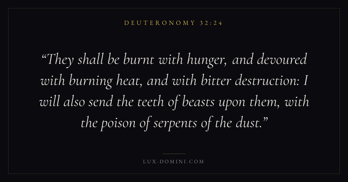 They shall be burnt with hunger, and devoured with burning heat, and with bitter destruction: I will also send the teeth of beasts upon them, with the poison of serpents of the dust.