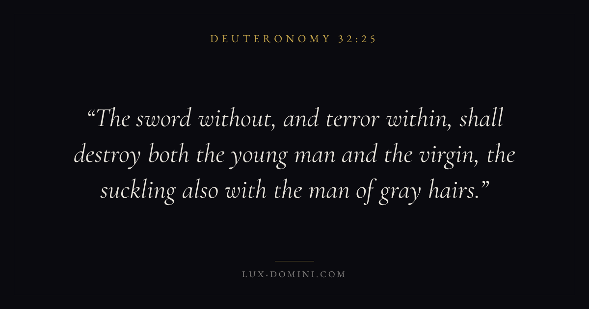 The sword without, and terror within, shall destroy both the young man and the virgin, the suckling also with the man of gray hairs.