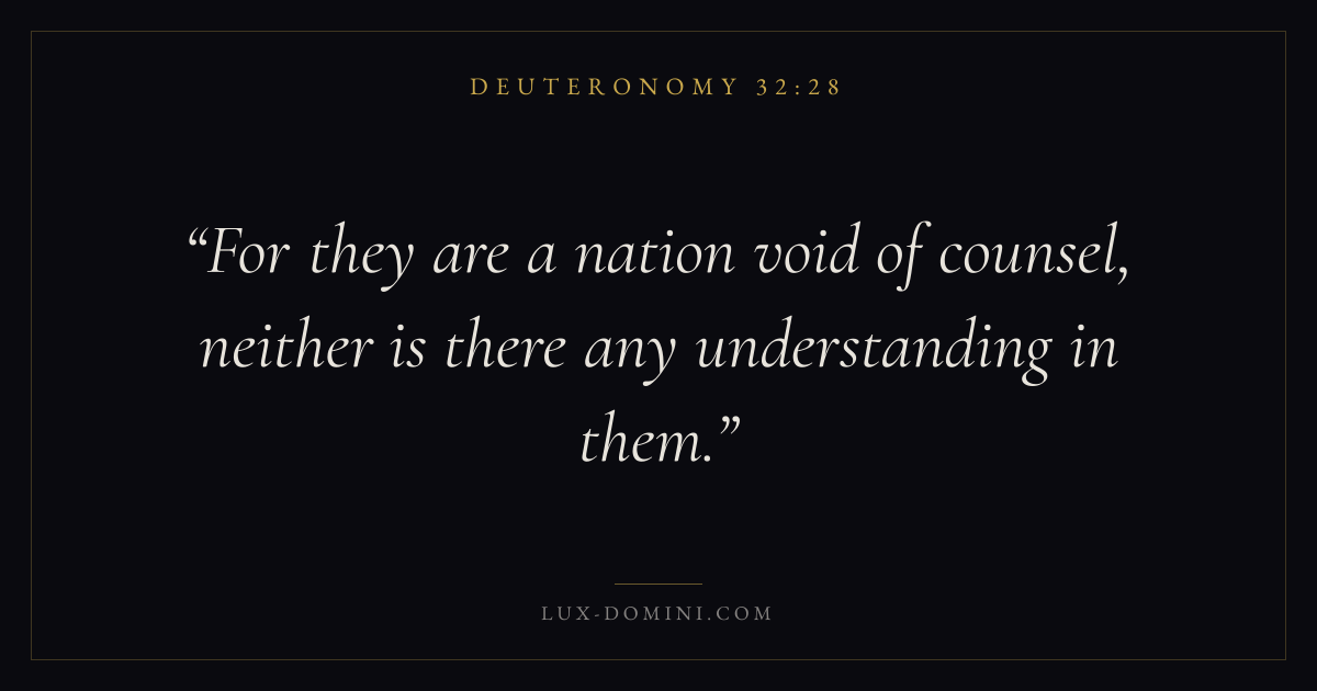 Books / Deuteronomy / Chapter 32 / Verse 28 ← Deuteronomy 32:27 Deuteronomy 32:28 Deuteronomy 32:29 → For they are a nation void of counsel, neither is there any understanding in them. Download verse card Share on Twitter Share on Facebook Pin it ✦ Key themes LoveWisdomJustice and mercyPeaceMemory Read with Deuteronomy 32:26Deuteronomy 32:27John 3:161 Corinthians 13:4 Related topics Bible verses about loveBible verses about wisdomBible verses about justice and mercyBible verses about peace ✦ Deuteronomy Chapter 32 verses V. 1 V. 2 V. 3 V. 4 V. 5 V. 6 V. 7 V. 8 V. 9 V. 10 V. 11 V. 12 V. 13 V. 14 V. 15 V. 16 V. 17 V. 18 V. 19 V. 20 V. 21 V. 22 V. 23 V. 24 V. 25 V. 26 V. 27 V. 28 V. 29 V. 30 V. 31 V. 32 V. 33 V. 34 V. 35 V. 36 V. 37 V. 38 V. 39 V. 40 V. 41 V. 42 V. 43 V. 44 V. 45 V. 46 V. 47 V. 48 V. 49 V. 50 V. 51 V. 52