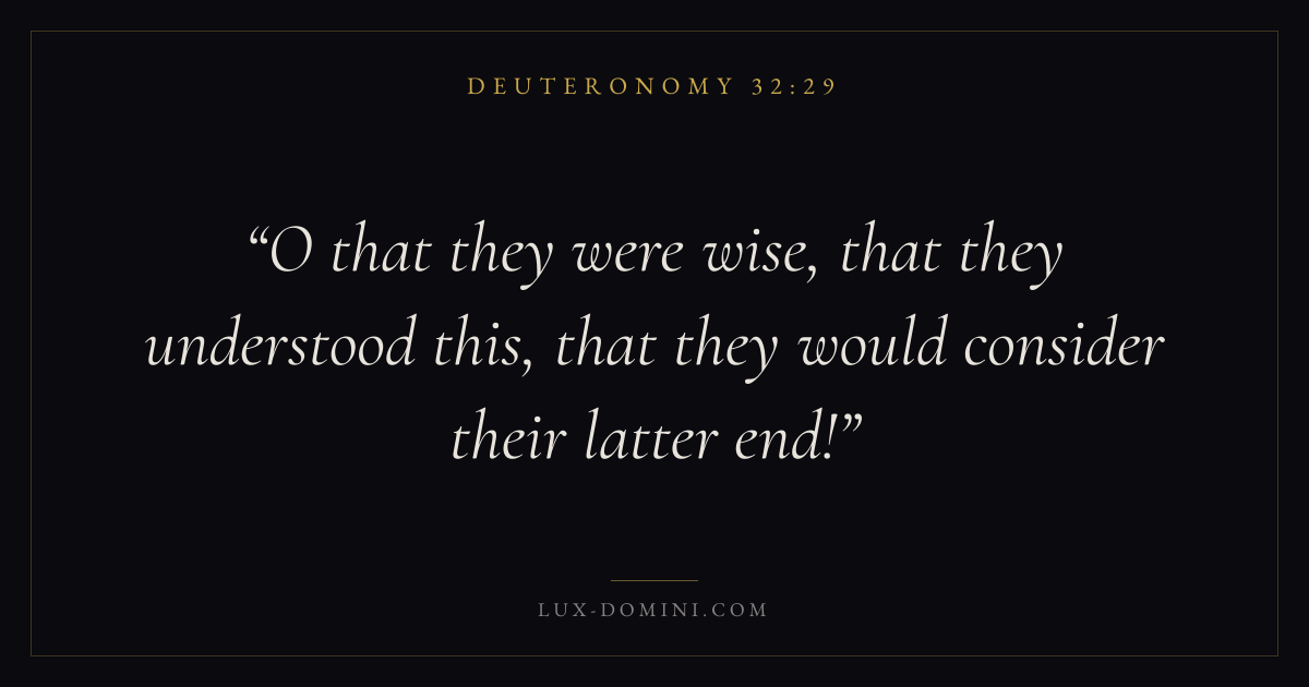 Books / Deuteronomy / Chapter 32 / Verse 29 ← Deuteronomy 32:28 Deuteronomy 32:29 Deuteronomy 32:30 → O that they were wise, that they understood this, that they would consider their latter end! Download verse card Share on Twitter Share on Facebook Pin it ✦ Key themes LoveWisdomJustice and mercyPeaceMemory Read with Deuteronomy 32:26Deuteronomy 32:27John 3:161 Corinthians 13:4 Related topics Bible verses about loveBible verses about wisdomBible verses about justice and mercyBible verses about peace ✦ Deuteronomy Chapter 32 verses V. 1 V. 2 V. 3 V. 4 V. 5 V. 6 V. 7 V. 8 V. 9 V. 10 V. 11 V. 12 V. 13 V. 14 V. 15 V. 16 V. 17 V. 18 V. 19 V. 20 V. 21 V. 22 V. 23 V. 24 V. 25 V. 26 V. 27 V. 28 V. 29 V. 30 V. 31 V. 32 V. 33 V. 34 V. 35 V. 36 V. 37 V. 38 V. 39 V. 40 V. 41 V. 42 V. 43 V. 44 V. 45 V. 46 V. 47 V. 48 V. 49 V. 50 V. 51 V. 52