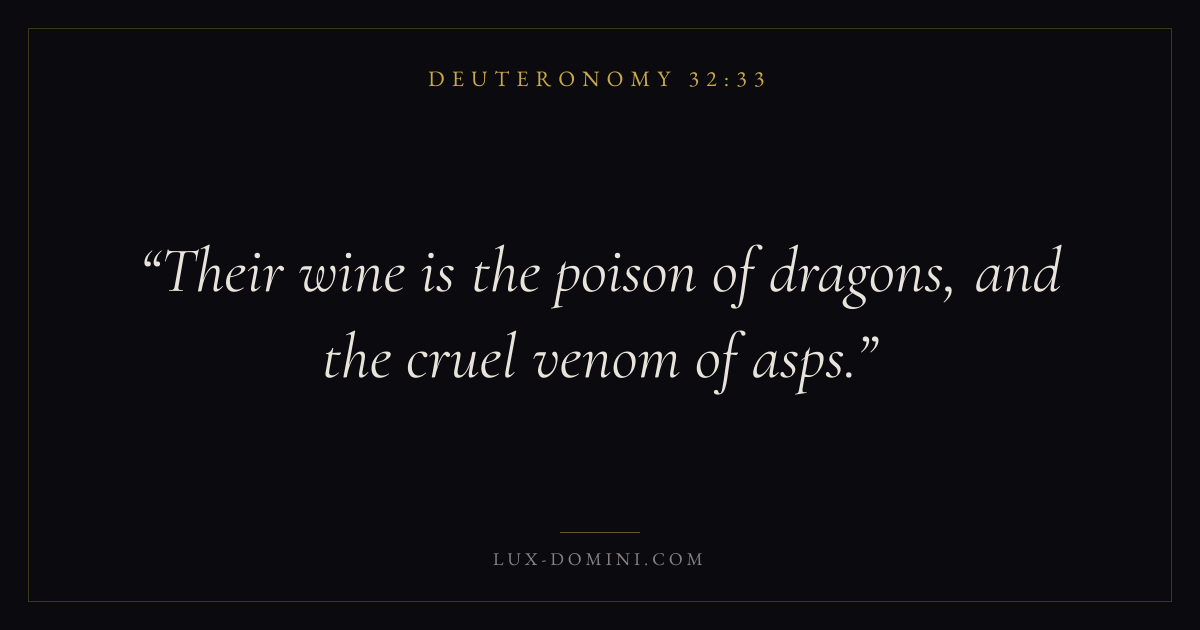 Books / Deuteronomy / Chapter 32 / Verse 33 ← Deuteronomy 32:32 Deuteronomy 32:33 Deuteronomy 32:34 → Their wine is the poison of dragons, and the cruel venom of asps. Download verse card Share on Twitter Share on Facebook Pin it ✦ Key themes LoveJustice and mercyPeaceTruthMemory Read with Deuteronomy 32:30Deuteronomy 32:31John 3:161 Corinthians 13:4 Related topics Bible verses about loveBible verses about justice and mercyBible verses about peaceBible verses about truth ✦ Deuteronomy Chapter 32 verses V. 1 V. 2 V. 3 V. 4 V. 5 V. 6 V. 7 V. 8 V. 9 V. 10 V. 11 V. 12 V. 13 V. 14 V. 15 V. 16 V. 17 V. 18 V. 19 V. 20 V. 21 V. 22 V. 23 V. 24 V. 25 V. 26 V. 27 V. 28 V. 29 V. 30 V. 31 V. 32 V. 33 V. 34 V. 35 V. 36 V. 37 V. 38 V. 39 V. 40 V. 41 V. 42 V. 43 V. 44 V. 45 V. 46 V. 47 V. 48 V. 49 V. 50 V. 51 V. 52